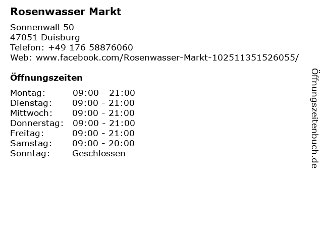 | Öffnungszeiten Rosenwasser Markt in Duisburg anzeigen | |