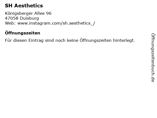 | Öffnungszeiten SH Aesthetics in Duisburg anzeigen | |