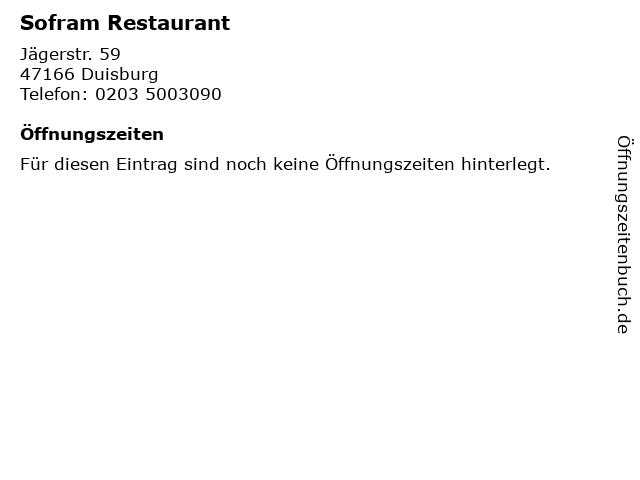 | Öffnungszeiten Sofram Restaurant in Duisburg anzeigen | |