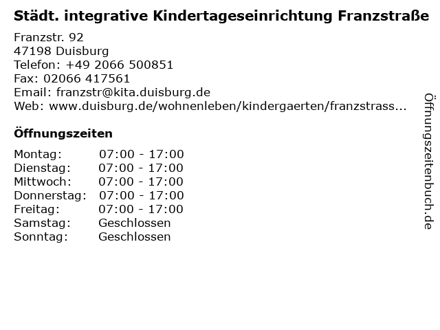 2 Familienzentrum und städt. Kindertageseinrichtung In den Haesen (Entfernung: 0,83 km) In den Haesen 94, 47198 Duisburg 3 Pestalozzischule (Städt. Förderschule, Schwerpunkt Sprache) (Entfernung: 0,88 km) Ottostr. 123, 47198 Duisburg 4 Städt. Kindertageseinrichtung Am Hochheider Busch (Entfernung: 0,97 km) Am Hochheider Busch 5, 47198 Duisburg 5 Städt. Kindertageseinrichtung Duisburger Straße 389 a (Entfernung: 1,05 km) Duisburger Straße 389a, 47198 Duisburg 6 Städt. Kindertageseinrichtung Duisburger Straße 257 (Entfernung: 1,39 km) Duisburger Straße 257, 47198 Duisburg |