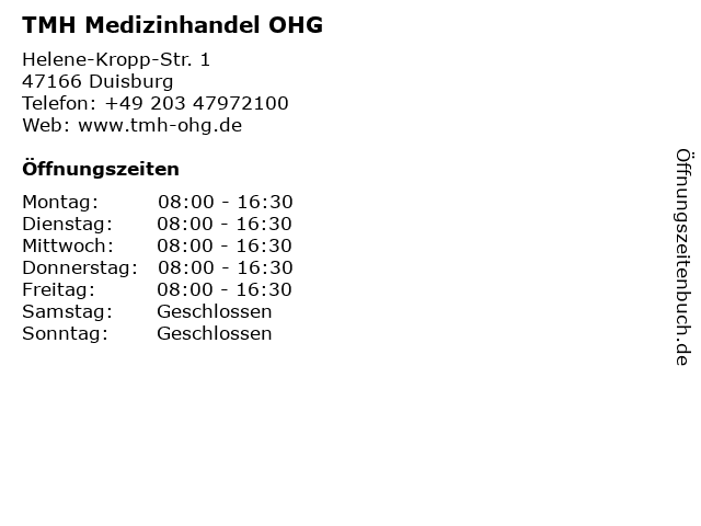 | Öffnungszeiten TMH Medizinhandel OHG in Duisburg anzeigen | |