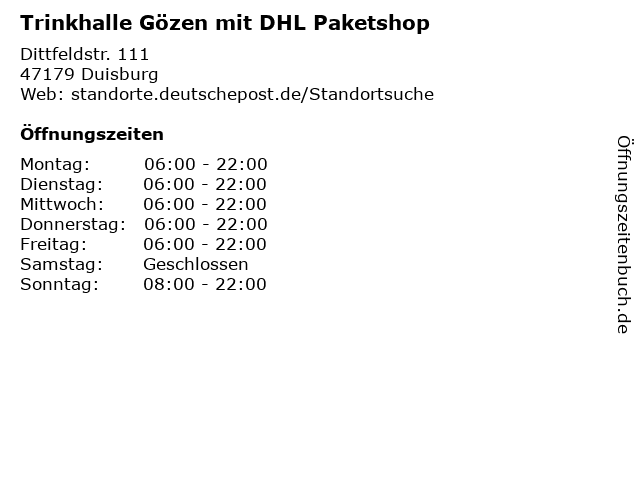 | Öffnungszeiten Trinkhalle Gözen mit DHL Paketshop in Duisburg anzeigen | |