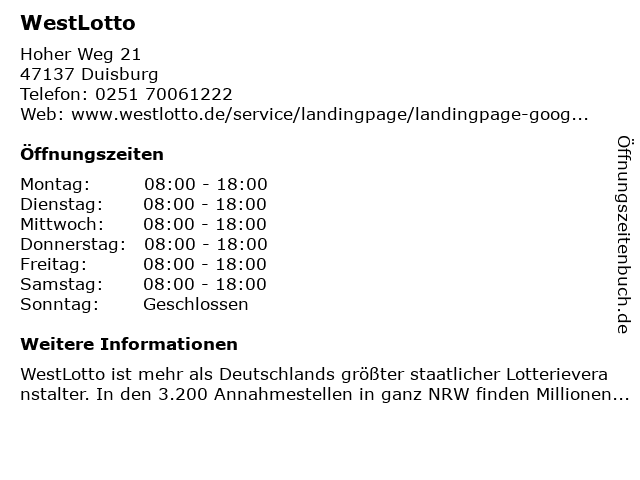 | Öffnungszeiten WestLotto in Duisburg anzeigen | |
