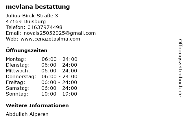 | Öffnungszeiten mevlana bestattung in Duisburg anzeigen | |