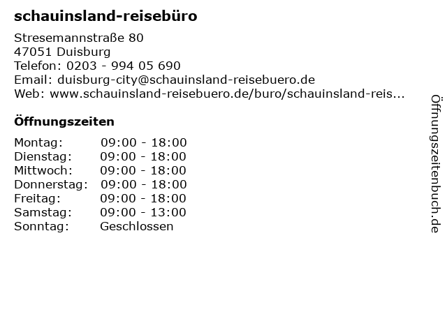 | Öffnungszeiten schauinsland-reisebüro in Duisburg anzeigen | |
