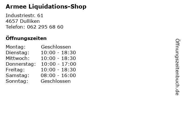| Öffnungszeiten Armee Liquidations-Shop in Dulliken anzeigen | |