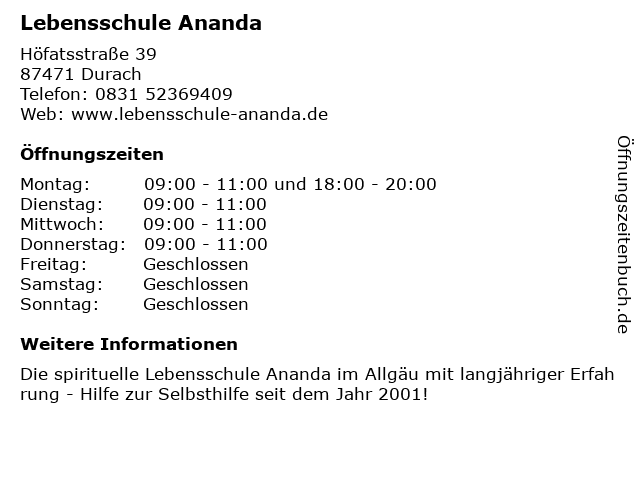 | Öffnungszeiten Lebensschule Ananda in Durach anzeigen | |