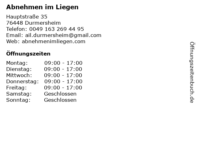 | Öffnungszeiten Abnehmen im Liegen in Durmersheim anzeigen | |