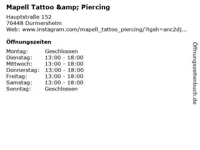 | Öffnungszeiten Mapell Tattoo & Piercing in Durmersheim anzeigen | |