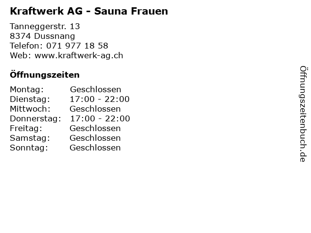 | Öffnungszeiten Kraftwerk AG - Sauna Frauen in Dussnang anzeigen | |