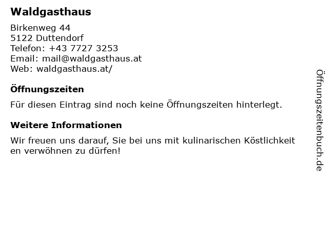 | Öffnungszeiten Waldgasthaus in Duttendorf anzeigen | |