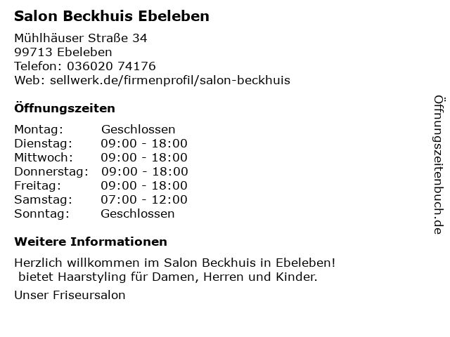 | Öffnungszeiten Salon Beckhuis Ebeleben in Ebeleben anzeigen | |