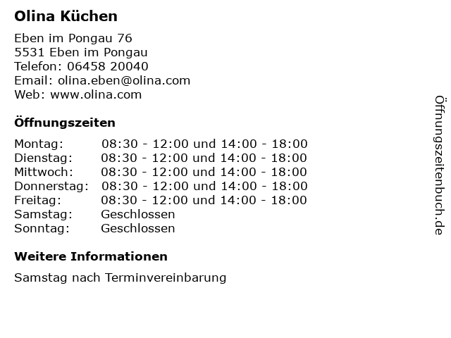 | Öffnungszeiten Olina Küchen in Eben im Pongau anzeigen | |
