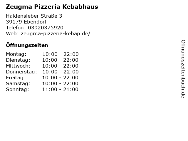 | Öffnungszeiten Zeugma Pizzeria Kebabhaus in Ebendorf anzeigen | |