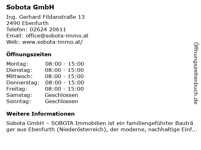 | Öffnungszeiten Sobota GmbH in Ebenfurth anzeigen | |