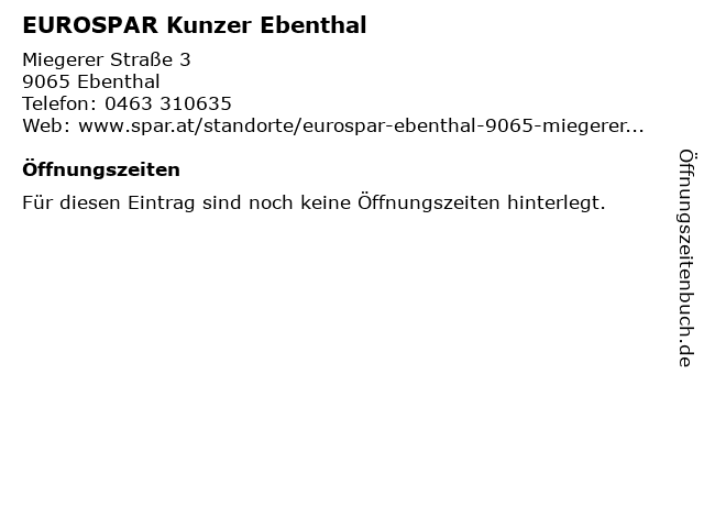 | Öffnungszeiten EUROSPAR Kunzer Ebenthal in Ebenthal anzeigen | |
