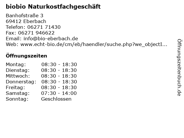 | Öffnungszeiten biobio Naturkostfachgeschäft in Eberbach anzeigen | |