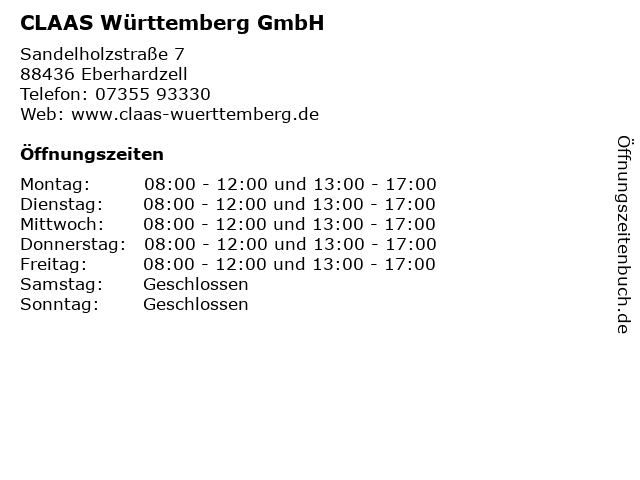 | Öffnungszeiten CLAAS Württemberg GmbH in Eberhardzell anzeigen | |