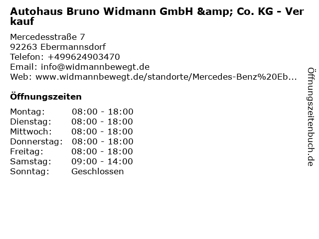 1 Autohaus Bruno Widmann GmbH & Co. KG - Verkauf (Entfernung: 9,70 km) Heinrich-Hertz-Straße 2, 92224 Amberg 2 Autohaus Bruno Widmann GmbH & Co. KG - Werkstatt Pkw (Entfernung: 0,00 km) Mercedesstraße 7, 92263 Ebermannsdorf 3 Autohaus Bruno Widmann GmbH & Co. KG - Werkstatt Nfz (Entfernung: 0,00 km) Mercedesstraße 7, 92263 Ebermannsdorf 4 Autohaus Bruno Widmann GmbH & Co. KG - Teile/Zubehör (Entfernung: 0,00 km) Mercedesstraße 7, 92263 Ebermannsdorf 6 Autohaus Widmann GmbH & Co. KG - Werkstatt Nutzfahrzeuge (Entfernung: 9,70 km) Heinrich-Hertzstrasse 2, 92224 Amberg |