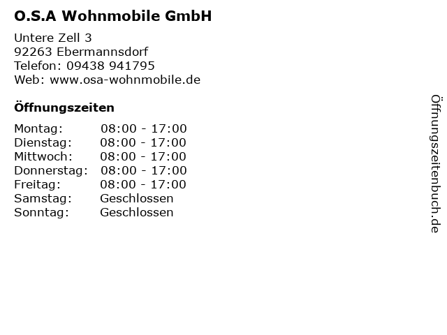 | Öffnungszeiten O.S.A Wohnmobile GmbH in Ebermannsdorf anzeigen | |