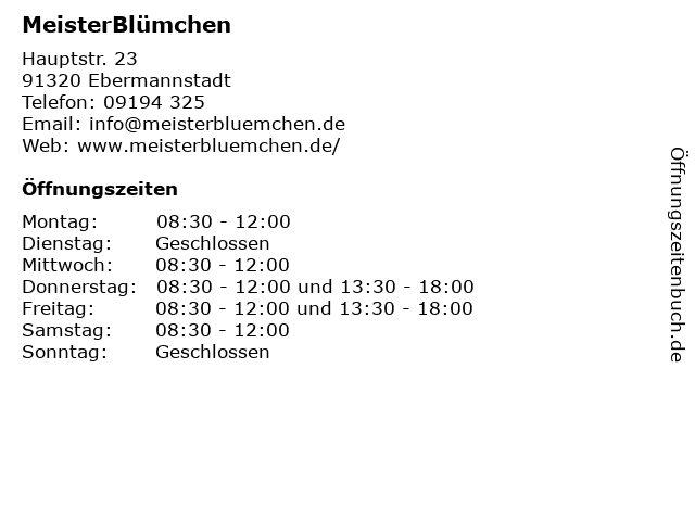 | Öffnungszeiten MeisterBlümchen in Ebermannstadt anzeigen | |