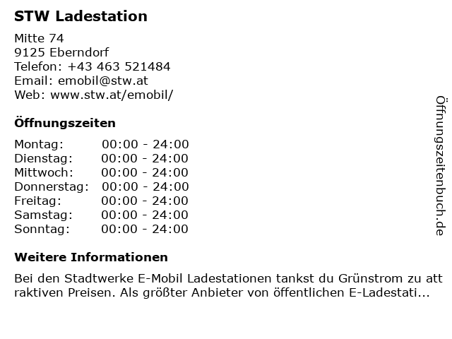 | Öffnungszeiten STW Ladestation in Eberndorf anzeigen | |