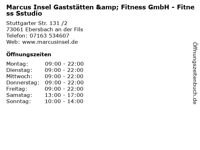 1 Marcus Insel Gaststätten & Fitness GmbH - Sauna Damen (Entfernung: 0,00 km) Stuttgarter Straße 131/2, 73061 Ebersbach/Fils 2 Marcus Insel Gaststätten & Fitness GmbH - Sauna gemischt (Entfernung: 0,00 km) Stuttgarter Straße 131/2, 73061 Ebersbach/Fils 6 |