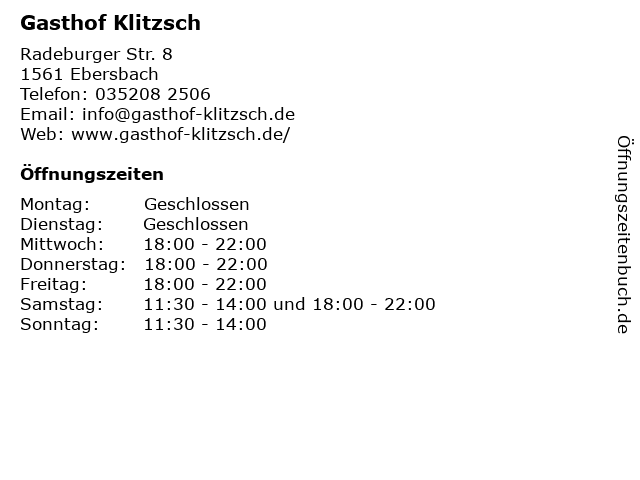 | Öffnungszeiten Gasthof Klitzsch in Ebersbach anzeigen | |