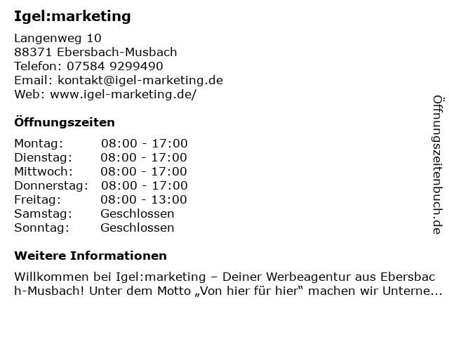 | Öffnungszeiten Igel:marketing in Ebersbach-Musbach anzeigen | |