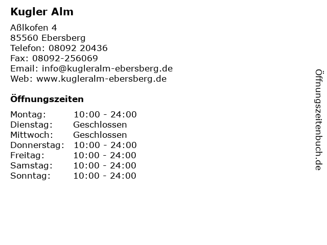 | Öffnungszeiten Kugler Alm in Ebersberg anzeigen | |