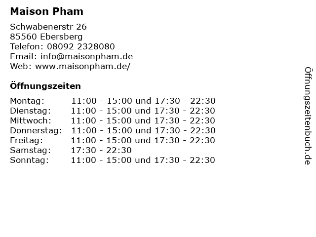 | Öffnungszeiten Maison Pham in Ebersberg anzeigen | |