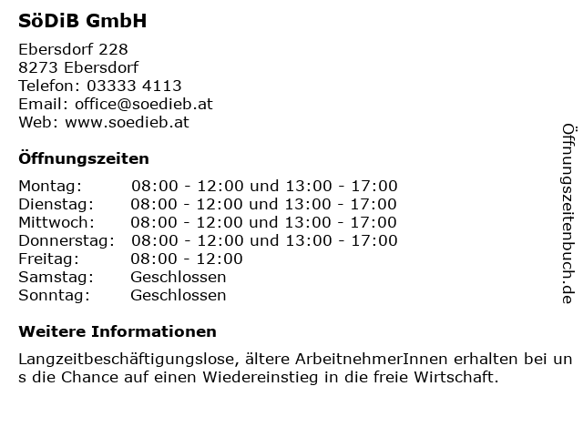| Öffnungszeiten SöDiB GmbH in Ebersdorf anzeigen | |