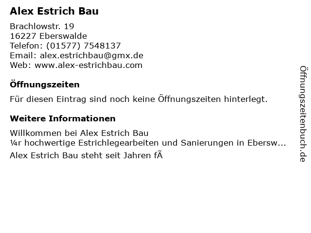 | Öffnungszeiten Alex Estrich Bau in Eberswalde anzeigen | |