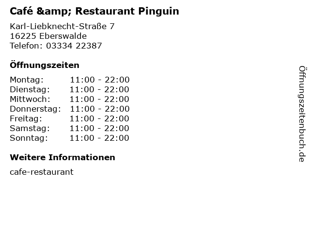 | Öffnungszeiten Café & Restaurant Pinguin in Eberswalde anzeigen | |
