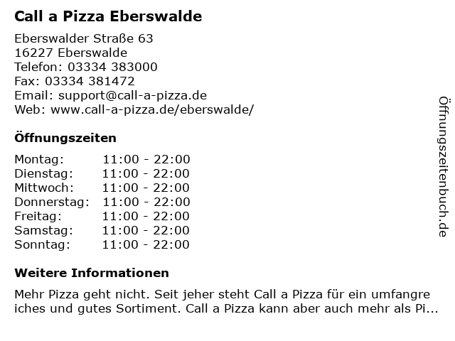 | Öffnungszeiten Call a Pizza Eberswalde in Eberswalde anzeigen | |
