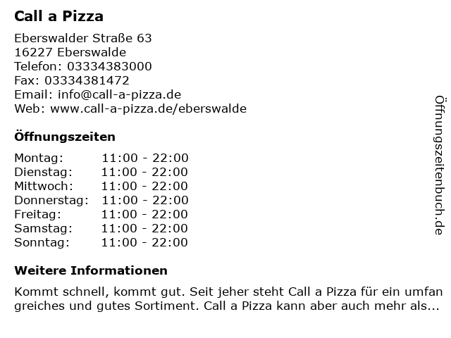 | Öffnungszeiten Call a Pizza in Eberswalde anzeigen | |