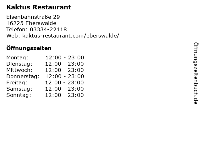 | Öffnungszeiten Kaktus Restaurant in Eberswalde anzeigen | |