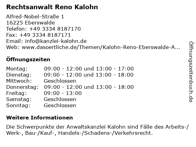| Öffnungszeiten Rechtsanwalt Reno Kalohn in Eberswalde anzeigen | |