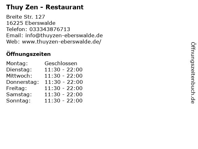 | Öffnungszeiten Thuy Zen - Restaurant in Eberswalde anzeigen | |