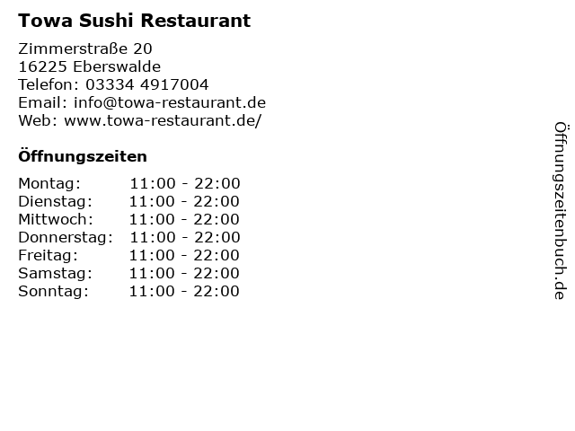 | Öffnungszeiten Towa Sushi Restaurant in Eberswalde anzeigen | |