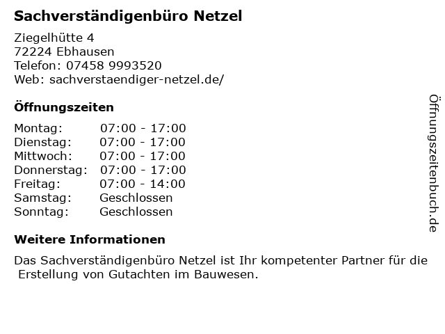 | Öffnungszeiten Sachverständigenbüro Netzel in Ebhausen anzeigen | |