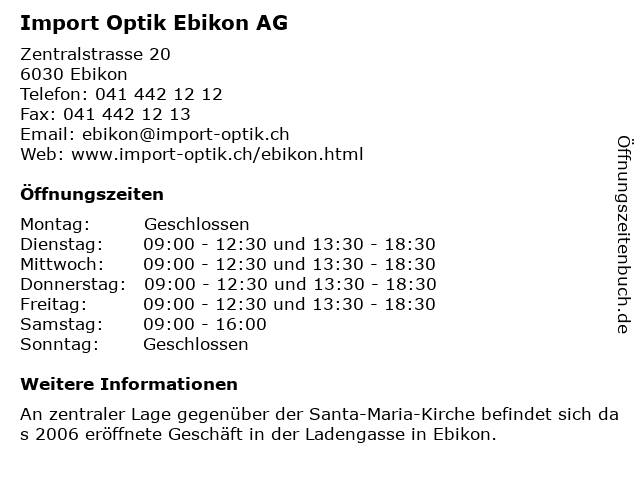 | Öffnungszeiten Import Optik Ebikon AG in Ebikon anzeigen | |