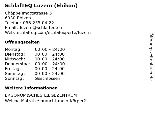 | Öffnungszeiten SchlafTEQ Luzern (Ebikon) in Ebikon anzeigen | |