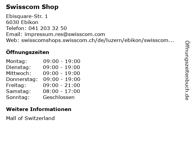 | Öffnungszeiten Swisscom Shop in Ebikon anzeigen | |