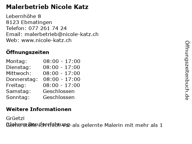 | Öffnungszeiten Malerbetrieb Nicole Katz in Ebmatingen anzeigen | |