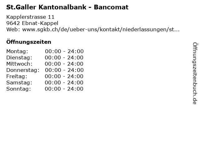 | Öffnungszeiten St.Galler Kantonalbank - Bancomat in Ebnat-Kappel anzeigen | |