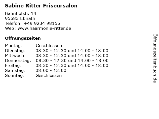 | Öffnungszeiten Sabine Ritter Friseursalon in Ebnath anzeigen | |
