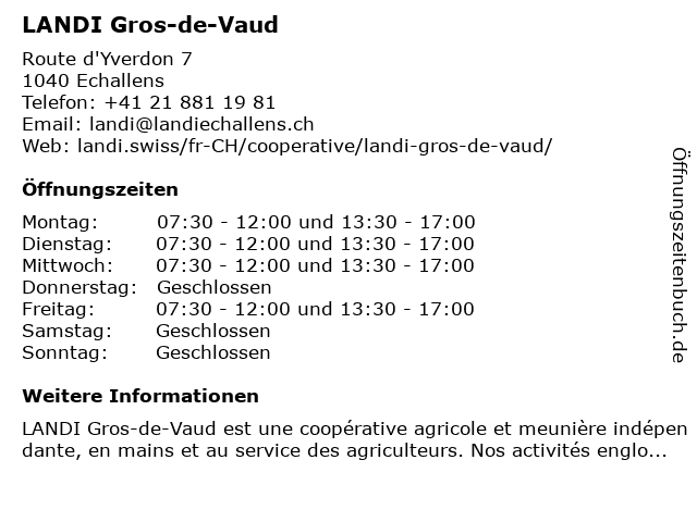 | Öffnungszeiten LANDI Gros-de-Vaud in Echallens anzeigen | |