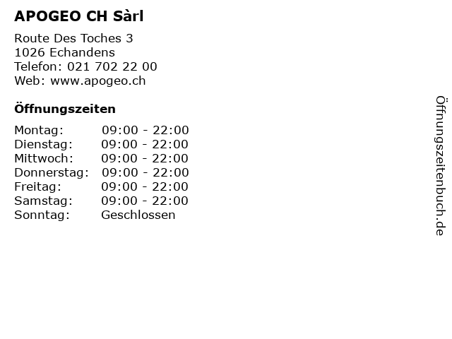| Öffnungszeiten APOGEO CH Sàrl in Echandens anzeigen | |