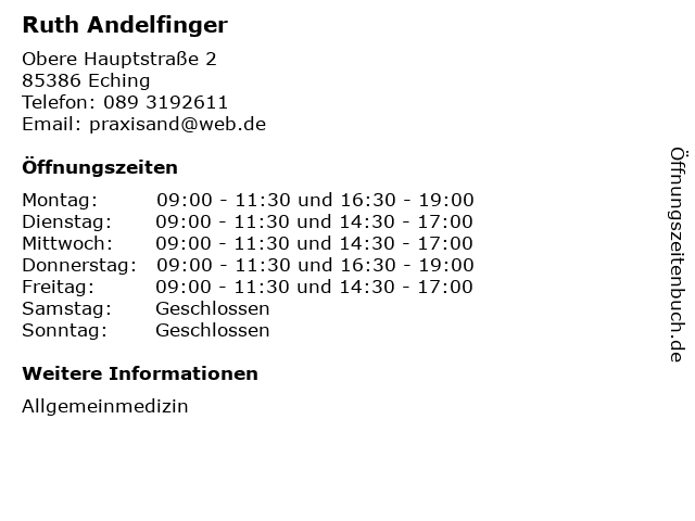 | Öffnungszeiten Ruth Andelfinger in Eching anzeigen | |